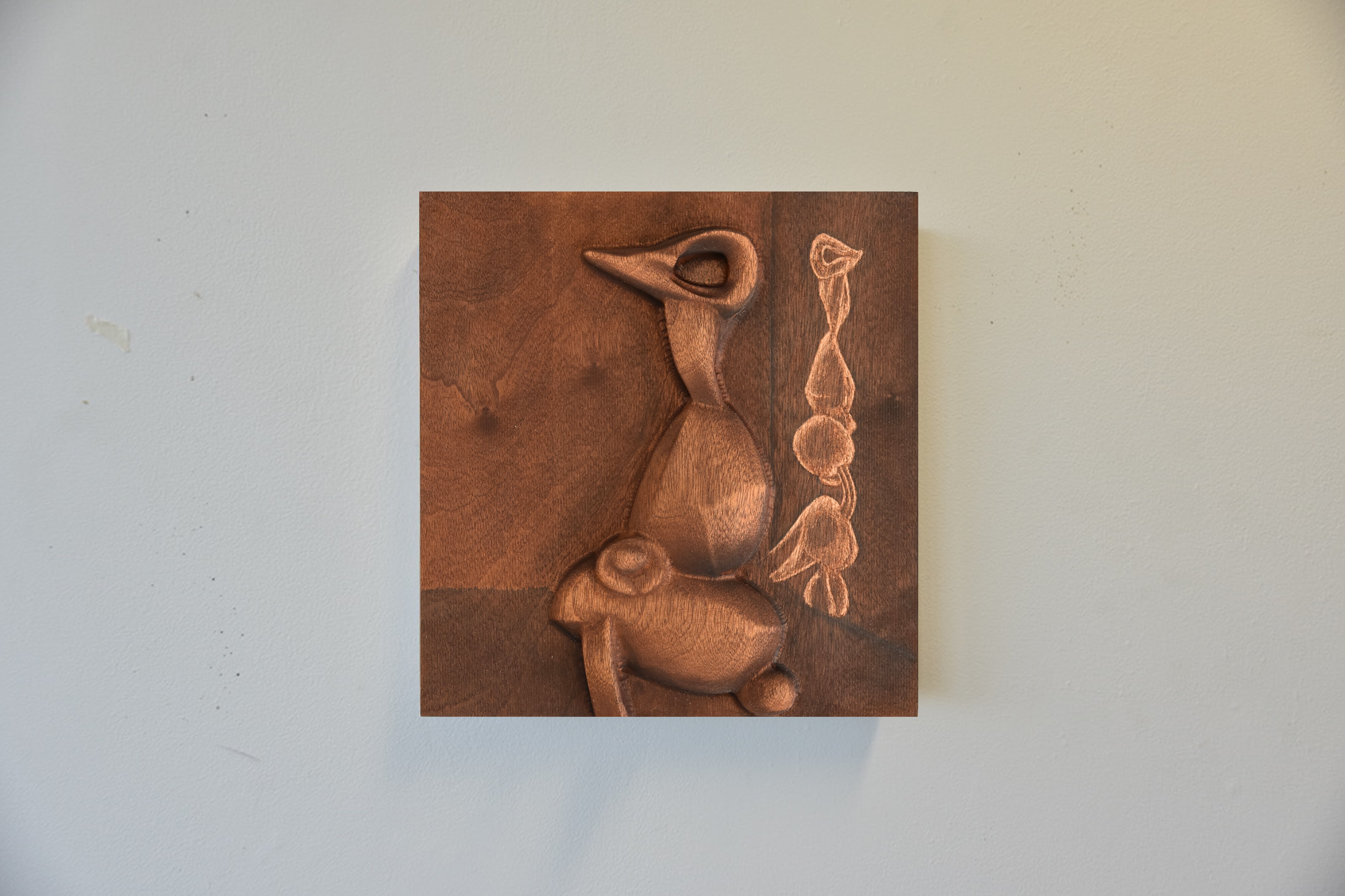 16. ‘miscommunication’ 2025, relief and etching on stained wood (26.6cm x 25.1cm x 1.5cm)